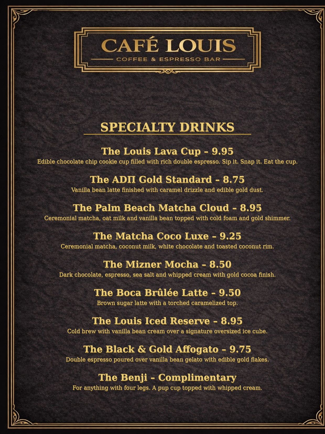 Indulge in Café Louis' curated collection of luxury espresso creations. From our iconic Louis Lava Cup to the indulgent Black & Gold Affogato, each specialty drink is crafted with premium ingredients, bold flavor profiles, and elevated presentation. Designed to complement the refined atmosphere of Boca Raton's most unique coffee and consignment lounge, this is more than coffee - it's an experience.